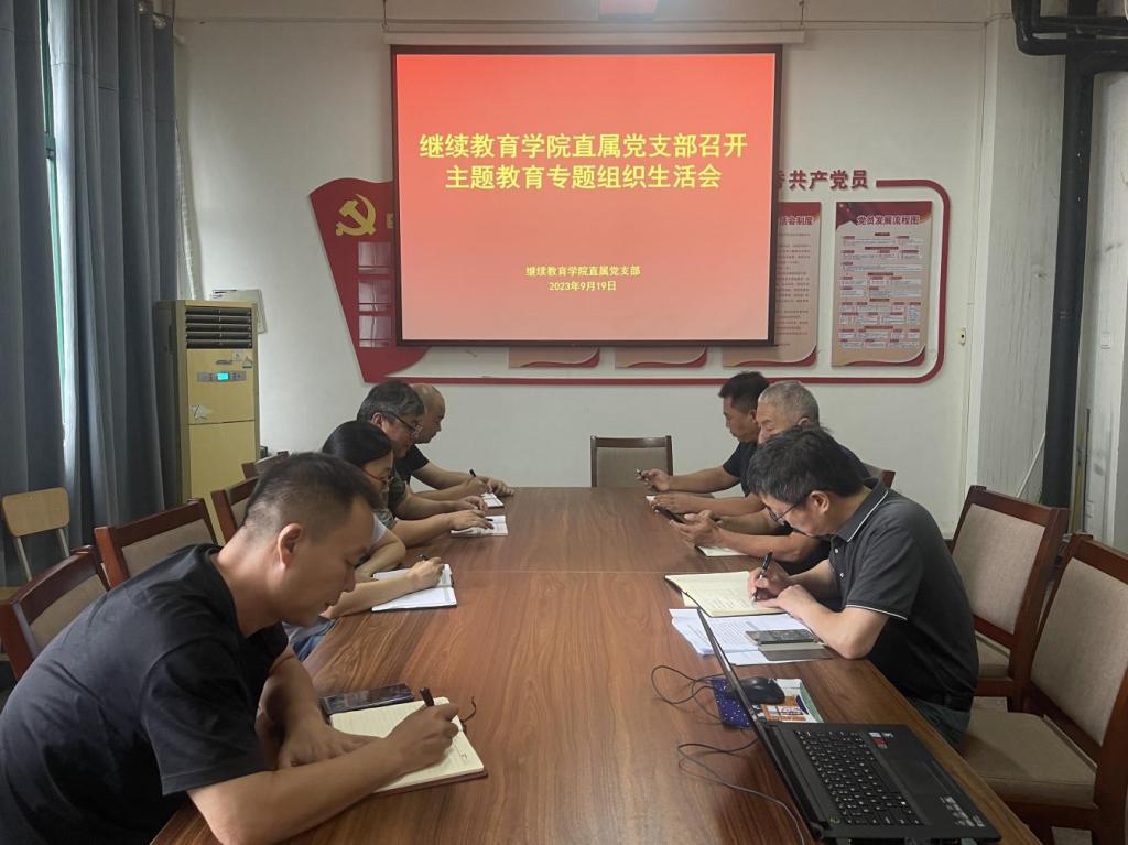 2023年9月19日,继续教育学院直属党支部组织全体党员召开习近平新时代中国特色社会主义思想主题教育专题组织生活会,会议由党支部书记薛建荣主持。