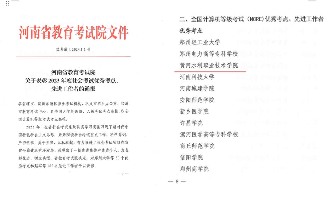 近日,河南省教育考试院下发《关于表彰2023年度社会考试优秀考点、优秀考试工作者的通报》(豫考成〔2024〕1 号)文件,我校获评“全国计算机等级考试优秀考点”,侯长伟等老师荣获“全国计算机等级考试先进工作者”称号,万径老师荣获“全国大学英语四、六级考试先进工作者”称号。