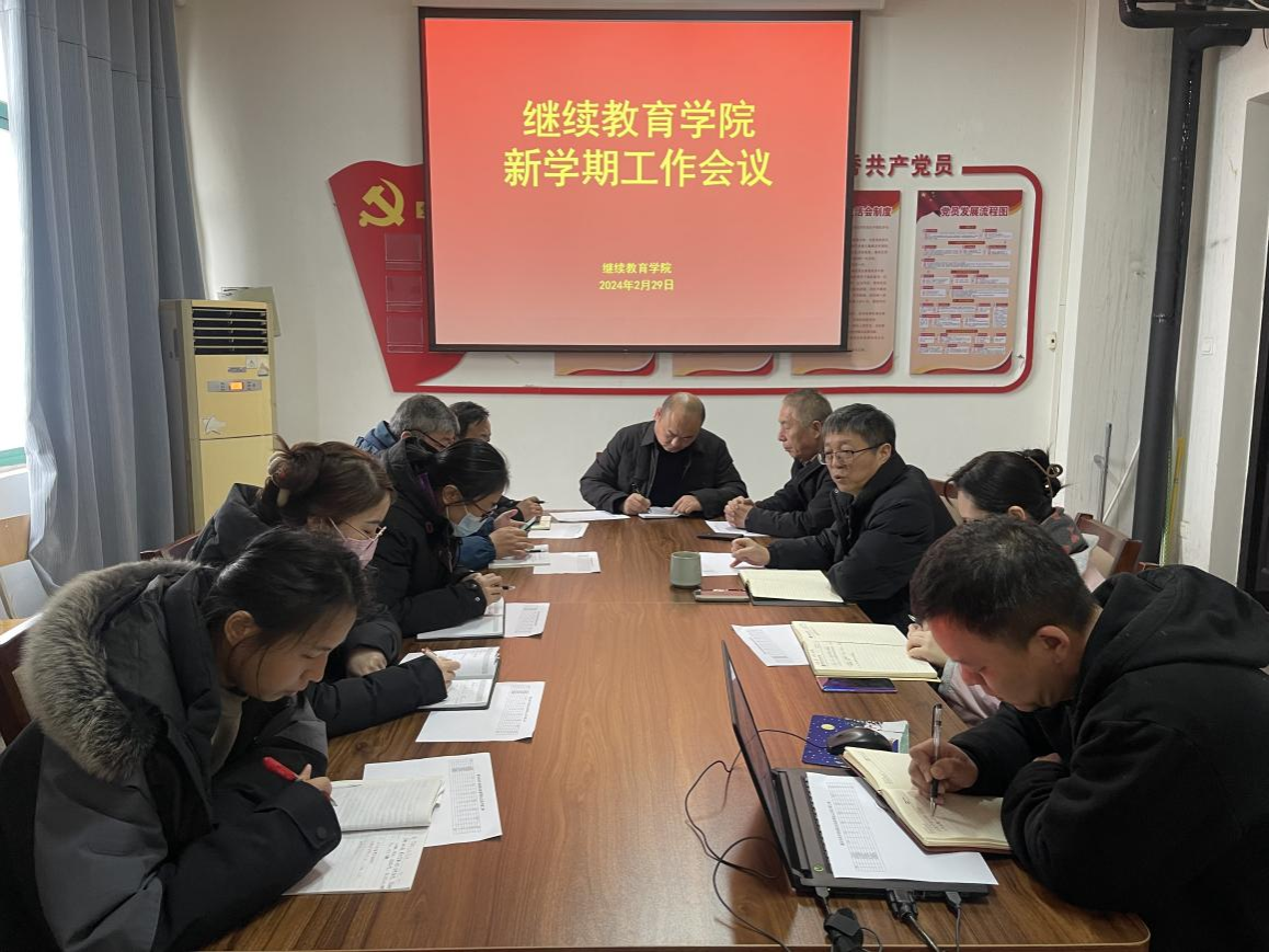 2024年2月29日,继续教育学院在4号教学楼四楼会议室召开新学期工作会议,会议由院长薛建荣主持,全体教职工参加。