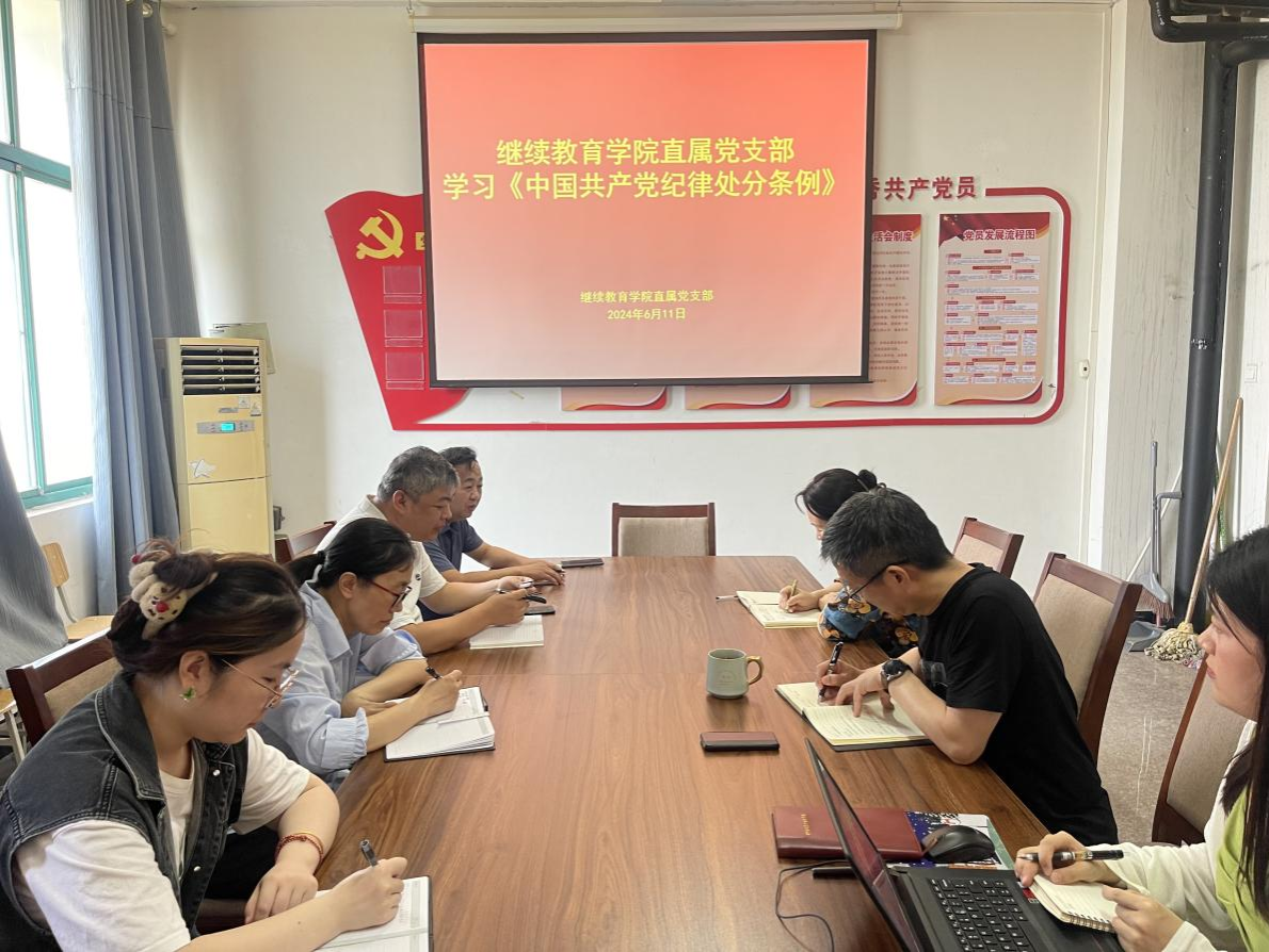 2024年6月11日,继续教育学院在4号教学楼四楼会议室开展党纪学习教育专题学习,会议由院长薛建荣主持,全体教职工参加。