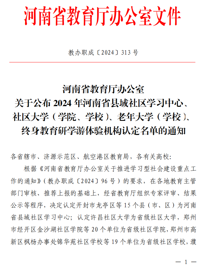 近日,河南省教育厅办公室下发《关于公布2024年河南省县域社区学习中心、社区大学(学院、学校)、老年大学(学校)、终身教育研学游体验机构认定名单的通知》(教办职成〔2024〕313号),我校获批河南省社区学院。