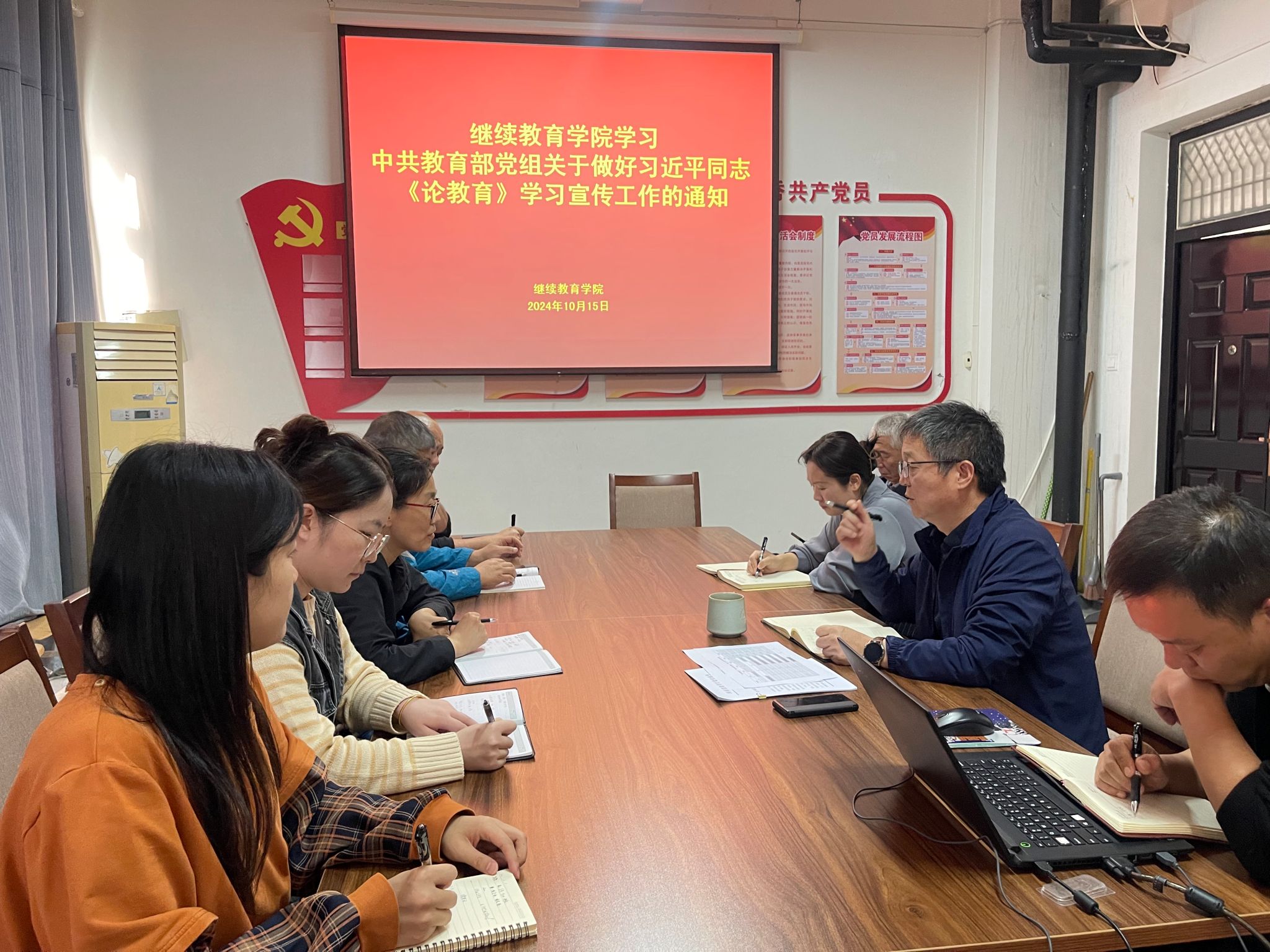 2024年10月15日,继续教育学院全体成员在4号教学楼四楼会议室学习中共教育部党组关于做好习近平同志《论教育》学习宣传工作的通知。