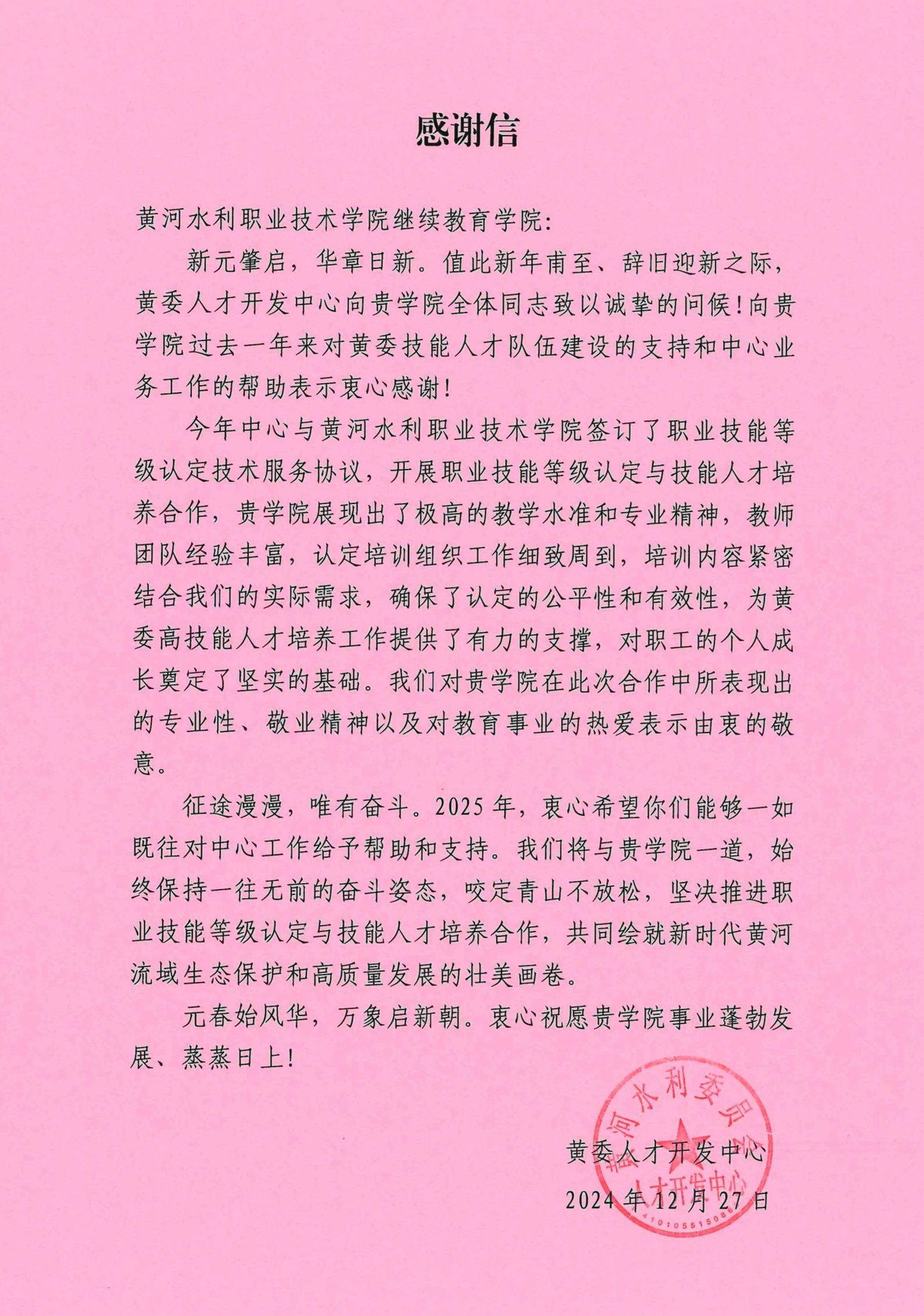 12月27日,黄河水利委员会人才开发中心向我校发来感谢信,感谢我校为黄委各基层单位职工开展的职业技能等级培训及认定工作。培训及认定工作涵盖河道修防工、电工、汽车维修工等多个工种,旨在满足企业对高素质、高技能人才的迫切需求,提升职工岗位胜任能力和创新实践水平。