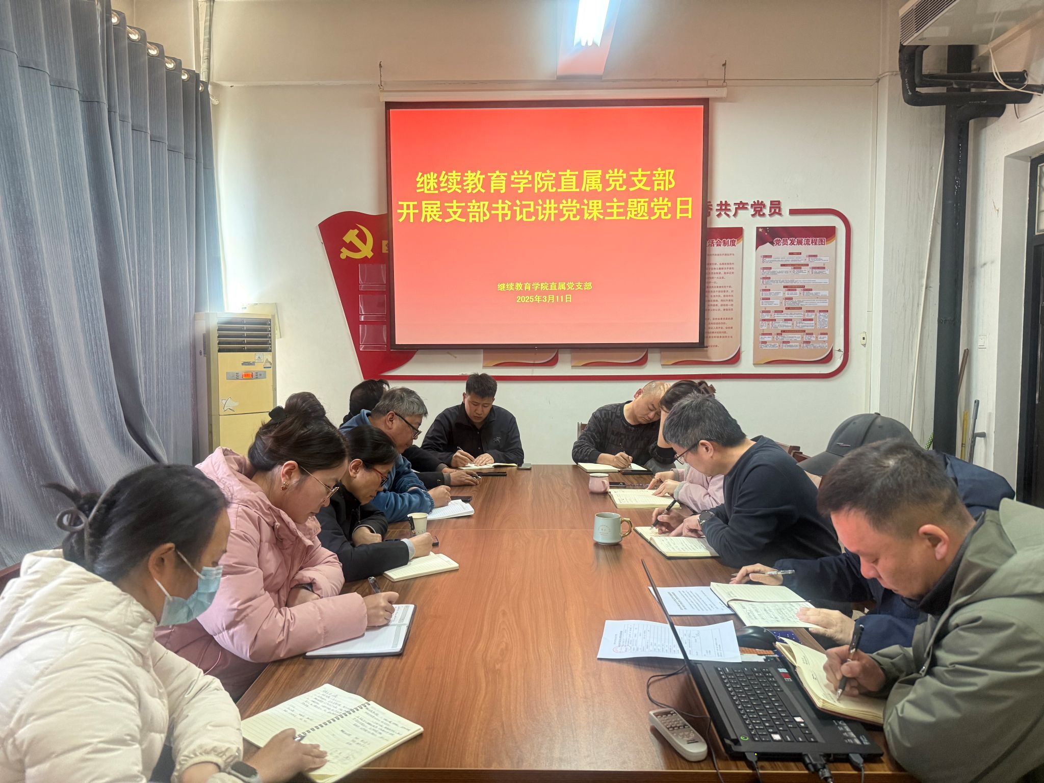 为深入学习贯彻习近平新时代中国特色社会主义思想,强化党员的政治素养和责任担当,3月11日,继续教育学院直属党支部组织全体党员干部在4号教学楼四楼会议室开展支部书记讲党课主题党日。