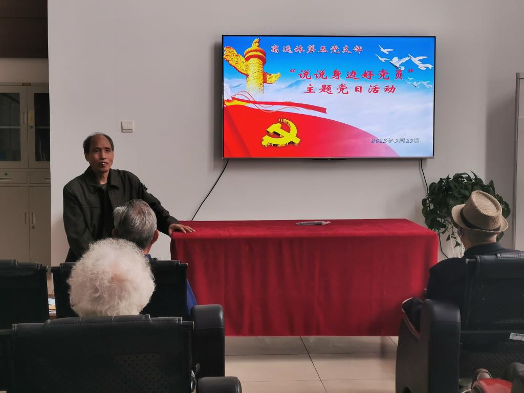 5月13日上午,离退休党总支第五党支部在离退休教职工活动中心开展“说说身边好党员”主题党日活动。支部书记陈永昌对开展“党史学习教育”活动以来,大家迅速落实学习要求,查找资料、收听收看广播电视,在微信平台交流学习体会,适时跟进时事政治学习等情况进行了概括总结。宣传委员葛长雄同志就学习党史认清形势,始终在思想上、政治上和党中央保持一致,做了辅导性讲解。