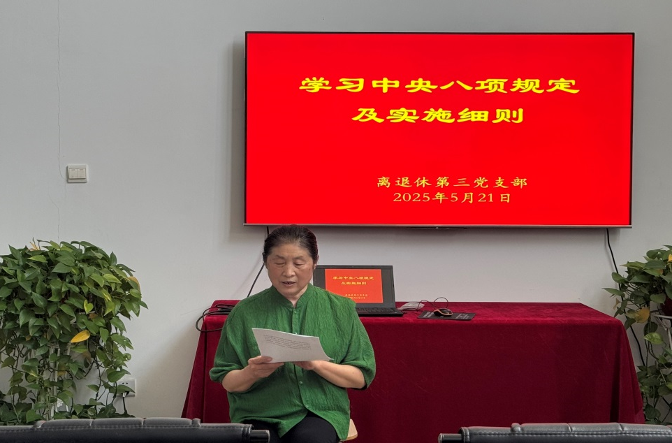 5月21日上午,退休第三党支部在离退休活动中心开展“深入贯彻中央八项规定精神”专题党课,通过“书记领学+细则解读+互动交流”,推动纪律教育入脑入心。