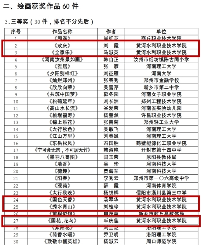 最终经专家委员会认真评选、网站公示等环节,我校闫天福、刘 霞、马淑英、汤翠华、刘桂珍、丰庆莲六位老师分获书法、绘画类三等奖。