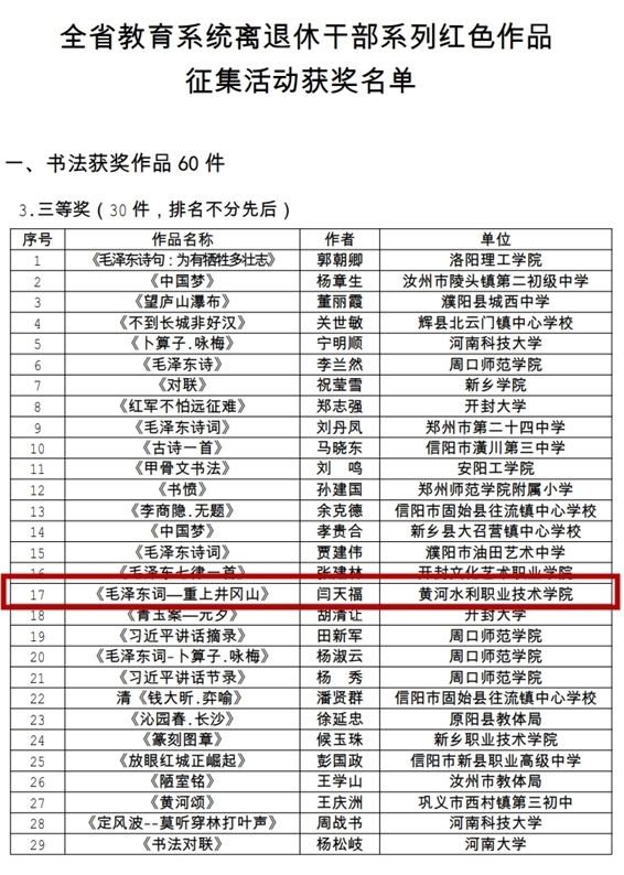 2024年4月至8月,河南省教育厅在全省教育系统中开展离退休干部系列红色作品征集活动。活动开展以来,我校离退处在老同志中广泛宣传、组织前期培训、认真备赛,最终共征集到参赛作品300余幅,后组织专家评审向教育厅推荐50幅作品。作品集中展示了我校老同志对以习近平同志为核心的党中央的衷心拥护,对全面建设社会主义现代化新河南的热切期盼,对推动河南教育发展关心关注的赤诚情怀。