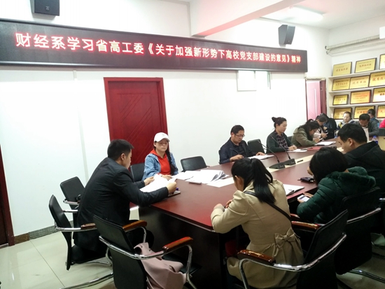 4月24日下午,财经系党总支在系党员会议室SY5412组织专题学习,学习省委高校工委《关于加强新形势下高校党支部建设的意见》,会议由系教工党支部书记苏永彪主持,财经系全体教工党员参加会议。