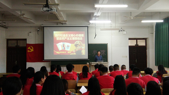 417日下午4:30,财经系党总支书记殷莺于JX2201为第43期发展对象和入党积极分子讲授了以“践行社会主义核心价值观,坚定共产主义理想信念”为主题的第一节党课。