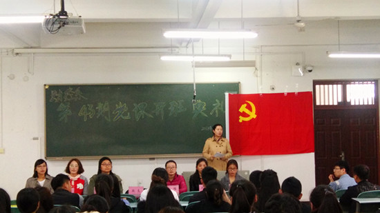 为加强入党积极分子学生的党性意识,深化党的基本理论、基本路线和基本纲领的教育,使学生更深入学习党的十九大精神内涵,4月9日中午12:30,财经系于JX4201举办了第43期入党积极分子党课开班典礼。莅临本次开班仪式的领导和老师有财经系党总支书记殷莺,党总支副书记胡晓慧,党总支办公室主任、分团委书记郝瑶,