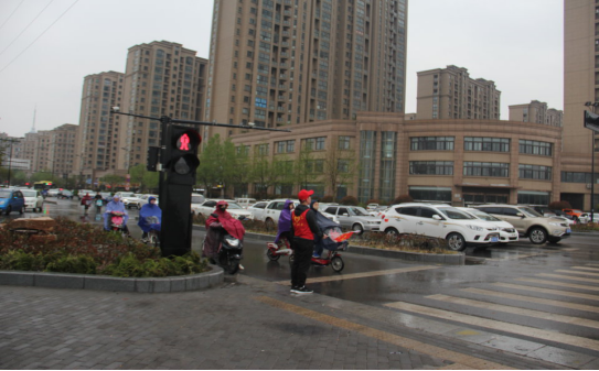 上午7点整,志愿者们身着统一服装,不畏雨水洗礼,在路口准时上岗,按规定动作绿灯放行红灯阻止, 并不断劝阻行人不要闯红灯、电动车不占机动车道行驶道,整个过程志愿者们始终面带微笑、文明引导。