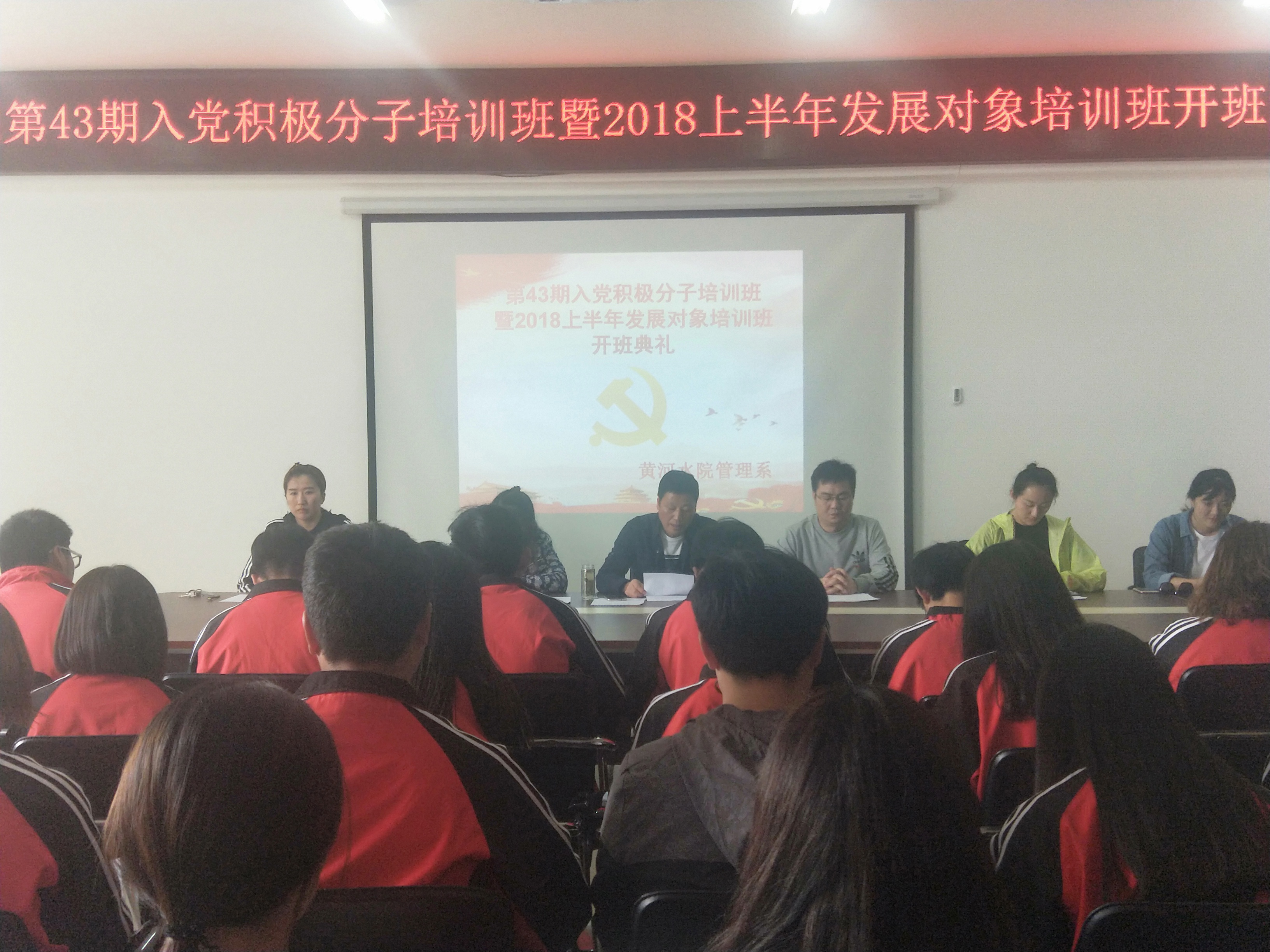 2018年4月11日,管理系第43期入党积极分子培训班暨2018年上半年发展对象培训班开班典礼在系党员活动室教室顺利召开。管理系党总支书记罗朝峰、副书记邹新忠、学生党支部书记牛钰、学生支部组织委员2016级辅导员贺若冰、学生支部宣传委员2017级辅导员朱孟昀、学生支部组织员2017级辅导员段然出席了本次党校开班典礼。活动由学生支部书记牛钰主持。