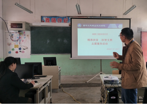 2018年3月23日上午信息工程系党总支书记商坤、副书记李晓娟带领系支教志愿服队前往刘店乡郭景村小学开展了“精准扶贫 扶智支教”志愿服务活动,暨计算机技能系列培训活动。出席此次活动的还有我校扶贫工作队来卫东、周宜富、及郭景村小学全体教师等20余人。