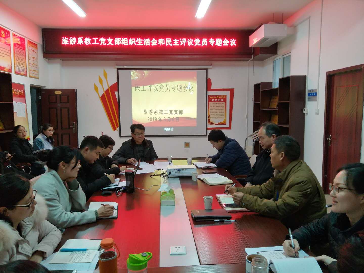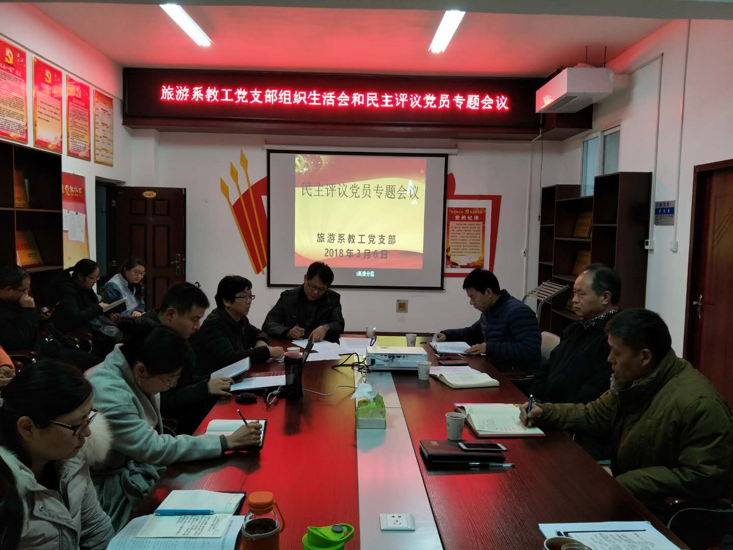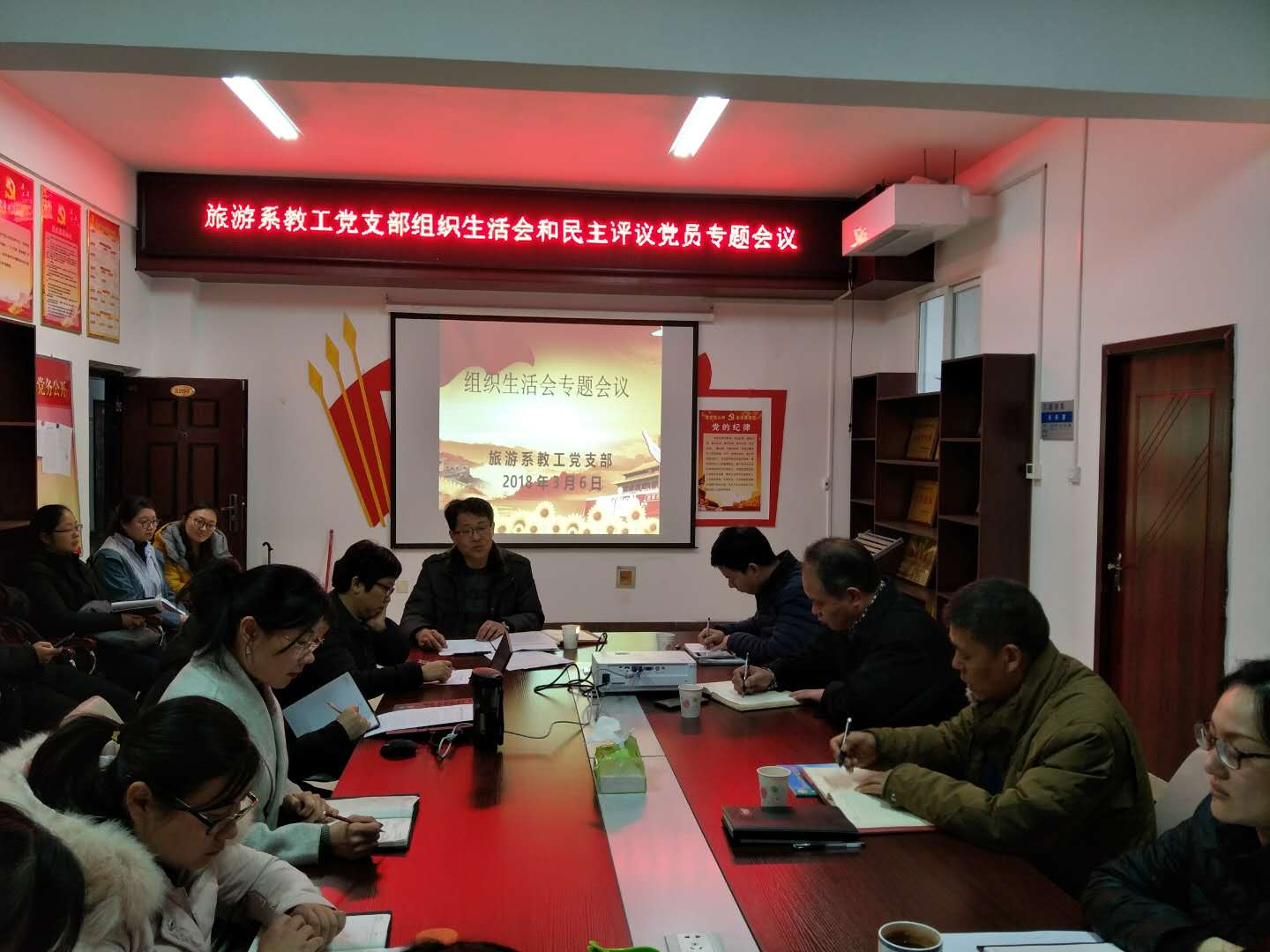 3月6日下午15:00,旅游教工党支部全体党员在SY5204党员活动室召开专题民主生活会和开展民主评议党员大会。黄河水院副院长杨士恒、旅游系党总支书记樊建科、主任焦红强、副主任余楠和旅游系全体教工党员参加了此次会议。此次大会共分为两个阶段,第一阶段是开展专题组织生活会,第二阶段是开展民主评议党员大会。