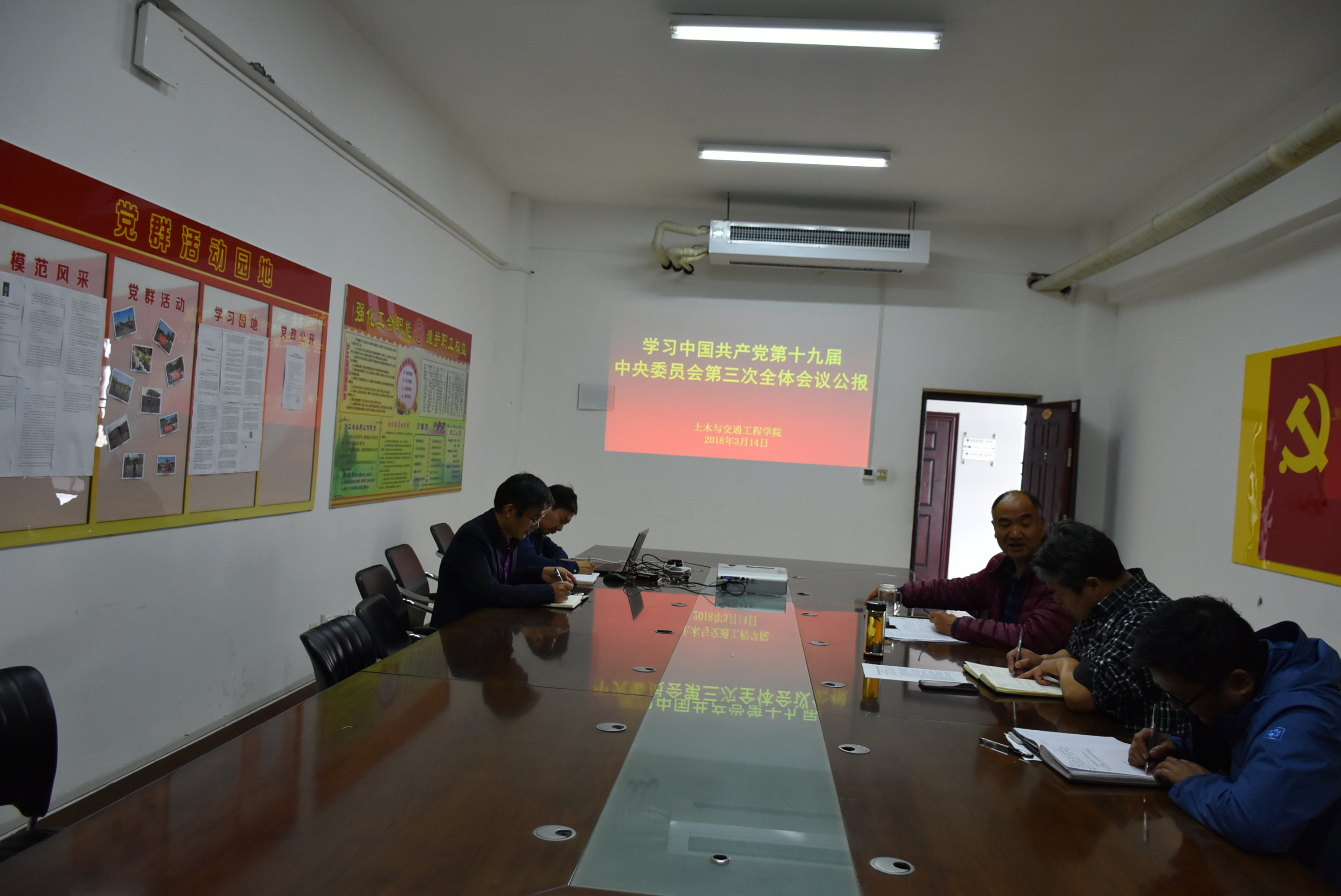 3月13日下午,学院召开专题会议,传达学习党的十九届三中全会精神,安排下一步学习任务。学院党总支书记赵杰主持会议并讲话,院长王付全、副书记师军良、副院长谭建领及其他成员参加了学习。与会人员学习了《中国共产党第十九届中央委员会第三次会议公报》,赵书记强调指出,党的十九届三中全会是在全国上下深入学习贯彻党的十九大精神的关键节点和我国改革开放新的历史关头召开的一次十分重要的会议,对深化党和国家机构改革作出部署,是站在新的历史起点上改革的接力探索、接续奋进,是社会主义制度自我完善和发展的必然要求。全院教职工要以高度的政治责任感和使命感,认真组织好全会精神的学习宣传贯彻工作,迅速兴起学习全会精神的热潮。认真学习党的十九届三中全会精神,以学习贯彻全会精神为动力,认真做好新学期的各项工作,推进我院各项工作取得新进展、见到新成效。