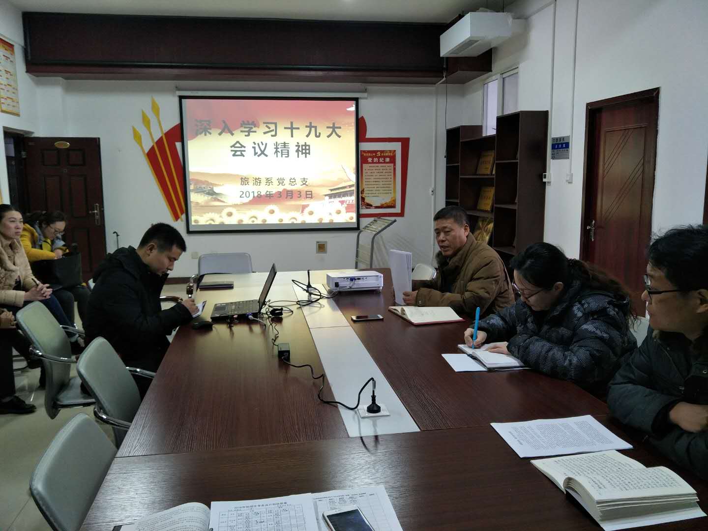 3月3日上午9:00,在旅游系党员活动室SY5204,旅游系党总支组织广大教工党员深入学习十九大会议精神,同时对旅游系3月6日即将召开的民主生活会,以及即将拉开帷幕的党建评估工作进行安排和部署。