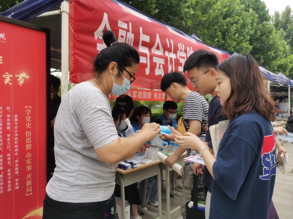 为进一步推进党史学习教育,金融与会计学院党总支深入基层广泛调研,准确把握师生需求,牢牢抓住重要工作节点,大力开展“我为师生办实事”实践活动69日,专升本考试当天,在考场前专门设置考生服务点,为考生准备了无声考场备用服装,防暑降温药品,防低血糖食物,口罩、消毒液、以及矿泉水等必要物资,以应对考生各类突发情况。
