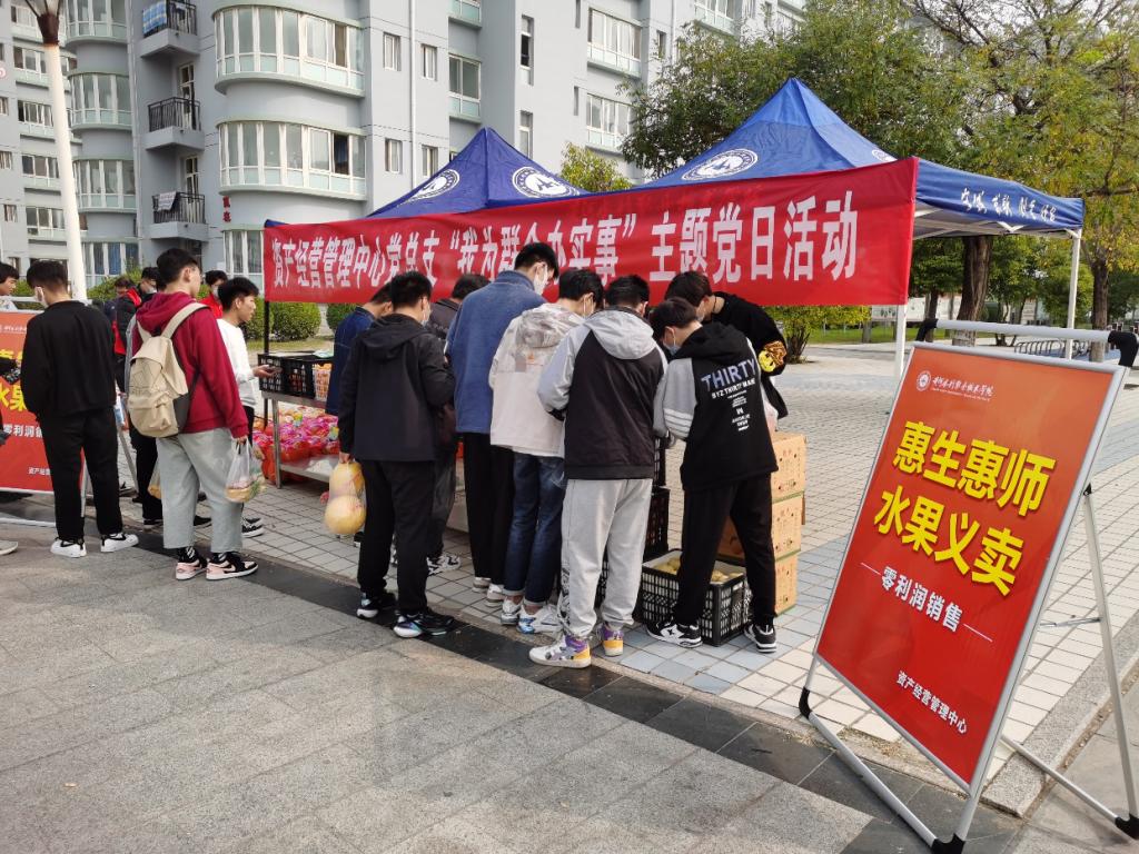 为推动党史学习教育持续走深走实,引导党员干部学党史、悟思想、办实事、开新局,10月26日资产经营管理中心党总支携手生活服务中心鲜果时光等商户,组织“我为群众办实事”主题党日活动,开展了“惠生惠师”爱心水果义卖同时向广大师生宣传疫情防控知识发放防疫用品党员干部积极参与用心用情用力服务广大师生,以实际行动践行初心使命,充分发挥了基层党组织战斗堡垒作用,获得了师生们的一致好评。(供图:资产经营管理中心)