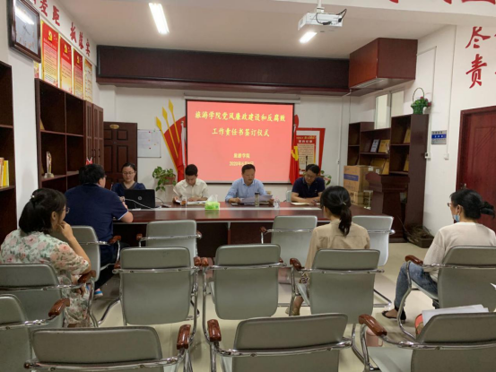 6月8日下午,旅游学院在党员活动室举行了2020年党风廉政建设责任书签订仪式。全体院领导和科级干部、教研室主任参加了签字仪式。党总支书记刘岩主持了签订仪式。