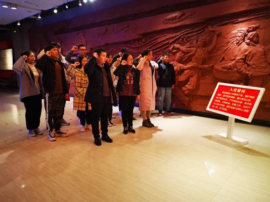 之后,在李峰老师的带领下,党员师生面对党旗,重温入党誓词,增强了教师和学生党员的责任感和使命感。