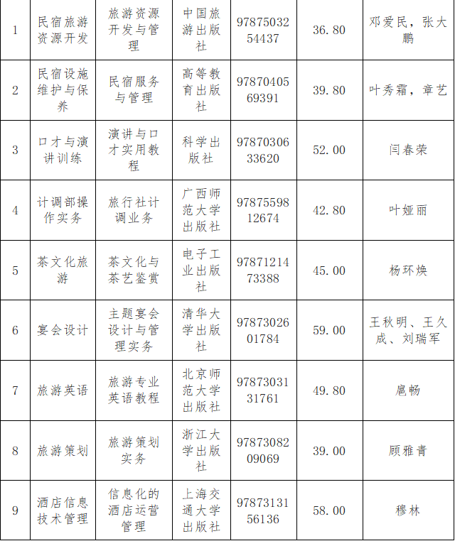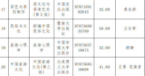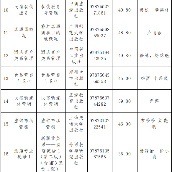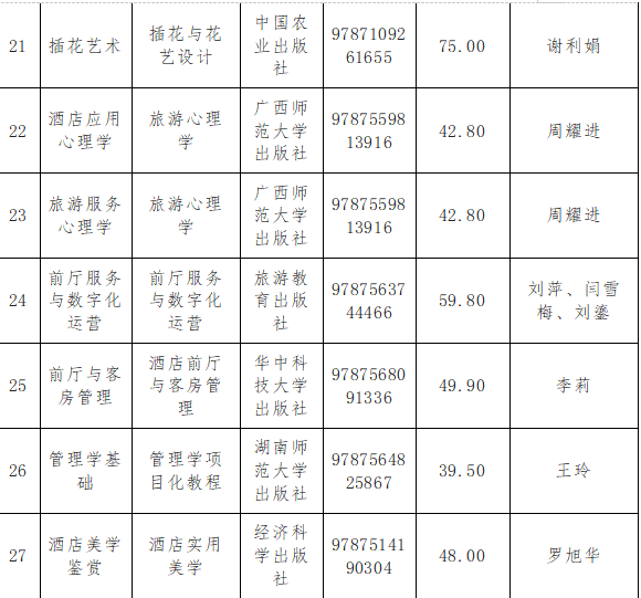 旅游学院教材严格遵照国家及学校方针政策,以及本学科人才培养方案,由教研室主任组织教师根据教学需求提出教材选用建议;教研室主任审核通过后,经旅游学院教材工作领导小组再次审核,在2024-2025学年第1学期共选取教材26本(酒店应用心理学与酒店服务心理学两门课使用同一本教材)。所有选用教材均为正规出版社出版发行的正版教材;均按程序进行选用;作为教材使用的未经正式出版发行的讲义等教学资料均专门组织专家审读研判,确保其内容的思想性、准确性、权威性和适用性;所有上报备案的教材信息准确无误,均可在国家版本数据中心数据服务平台、国家出版发行信息公共服务平台查询。