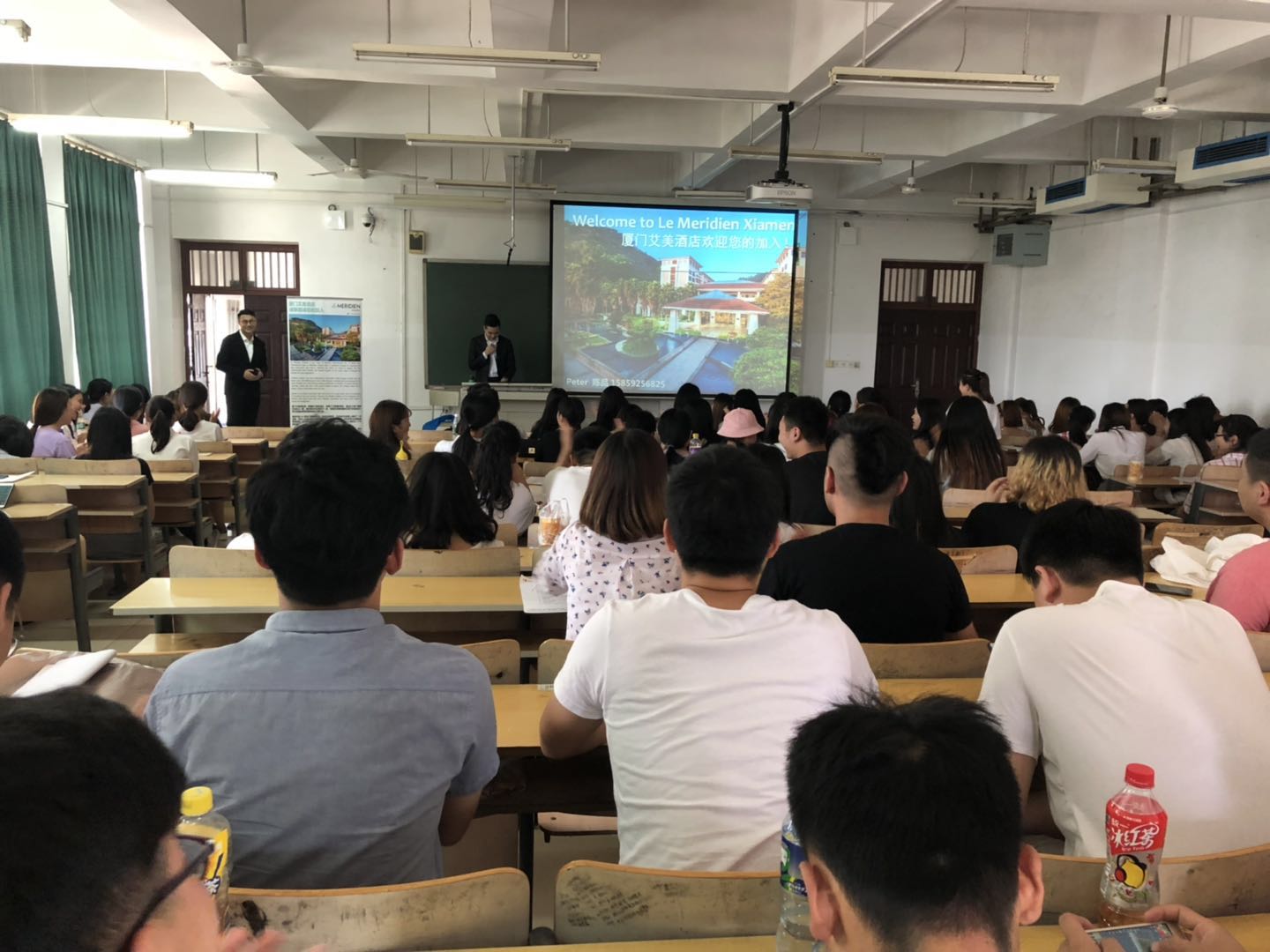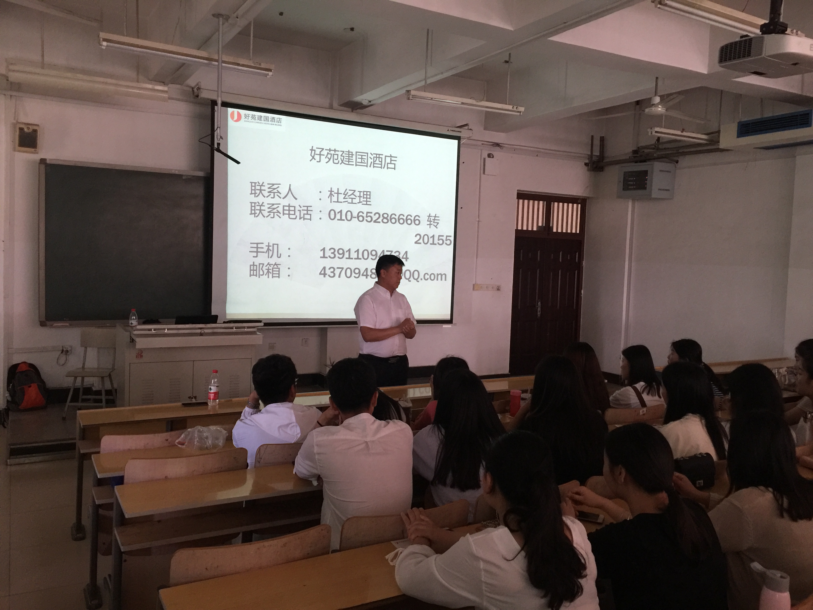 2018年5月28日,北京好苑、杭州开元、厦门艾美、郑州建业艾美、郑州美盛喜来登酒店五家五星级酒店来我校2号教学楼JX2302,针对2016级酒店管理专业学生,进行顶岗实习及就业的专题宣讲。 来自五家星级酒店一线的人力资源总监及招聘经理,分别对各酒店基本情况、就业需求、岗位薪资、岗位发展前景等进行了详细的介绍。此次实习就业宣讲为2016级酒店管理专业学生确定未来顶岗实习单位,乃至明确自身未来发展方向提供了条件。 北京好苑建国大酒店宣讲 杭州开元名都大酒店宣讲 厦门艾美大酒店宣讲