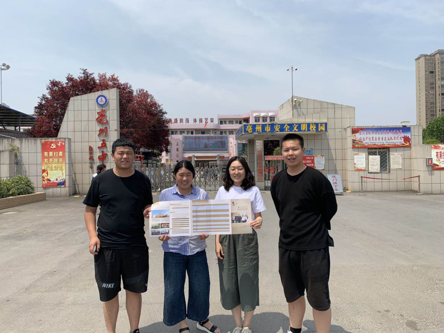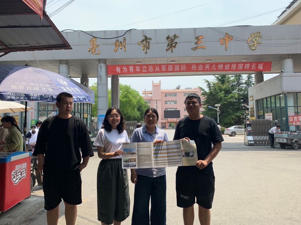 为更好的宣传我校2019年在安徽省高职普招招生,扩大生源范围,旅游学院程兴亚、尚晴两位老师带李元朝、张彪两名学生从5月29日至6月日重点走访皖北地区的普通高中。该线路招生宣传老师及学生克服天热,路远和学校不配合的困难,早出晚归,坚持招生宣传,共成功进入12所高中,全力吸引安徽省优质生源报考我校。另一方面也拉近了黄河水利职业技术学院与走访学校间的距离,便于今后建立稳固的生源基地,招生宣传工作取得了良好的效果。