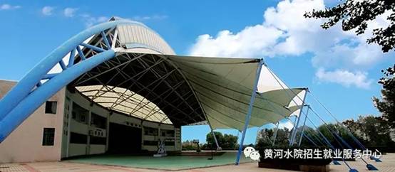 风雨球场,占地面积3386平方米,建设采用86 m跨度钢弓,现代复合膜结构,体现了强烈的时代气息,是中原最大的膜结构建筑之一。其贝壳造型寓意“洁白色半开的贝壳,孕育生命”。