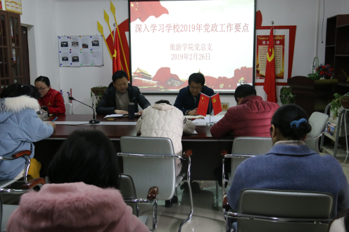 按照校党委会议要求及学校2019年上半年政治理论学习及思想道德教育计划的安排,更好的向全体教职员工传达会议精神、组织学习学校2019年党政工作要点,2月26日下午14:30,旅游学院党总支组织广大教职工在会议室召开集中学习传达学校2019年党政工作要点的专题会议。此次会议由党总支书记刘岩主持,副书记徐永红、副院长余楠及全体教职工参加了此次会议。