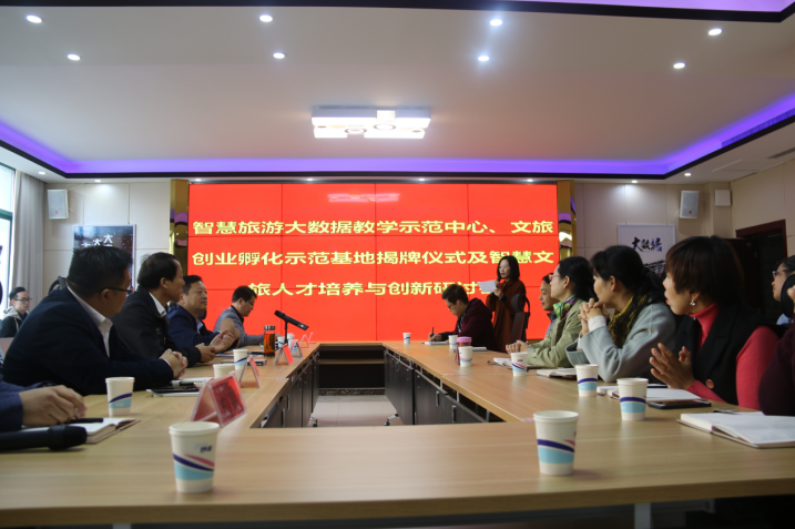 此次会议由旅游学院、上海金棕榈教育科技有限公司与郑州学一电子科技有限公司联合举办,会议共分为三个阶段。第一阶段,主要是我院智慧旅游大数据教学示范中心、文旅创业孵化示范基地揭牌仪式;第二阶段是智慧文旅人才培养与创新研讨会;第三阶段是我院智慧旅游大数据教学示范中心、文旅创业孵化示范基地及实训室的参观。