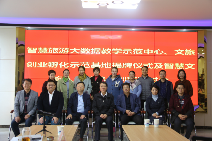 2019年10月15日上午十点,由上海金棕榈教育科技有限公司、黄河水院旅游学院、郑州学一电子科技有限公司联合举办的智慧旅游大数据教学示范中心、文旅创业孵化示范基地揭牌仪式及智慧文旅人才培养与创新研讨会,在五号实训楼5201成功举办。开封市文化广电和旅游局副局长张克彬,开封市导游服务管理中心主任张 平,旅游学院党总支书记刘 岩,金棕榈教育科技有限公司总经理陈 亮,郑州学一电子科技有限公司总经理王 翔及河南大学、焦作大学等兄弟院校的十余位老师和嘉宾出席了此次会议。旅游学院党总支副书记徐永红、国家金牌导游王启、旅游管理教研室主任张宾宾等旅游管理专业8位专业老师参加了研讨会。