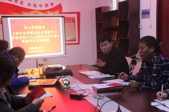 11月14日下午14:30,在旅游系党员活动室SY5204,旅游系党总支组织广大教工党员认真学习贯彻落实《黄河水利职业技术学院学习贯彻党的十九大精神工作方案》及相关文件的精神。此次会议由旅游系党总支书记樊建科主持,旅游系全体教工党员参加了此次会议。
