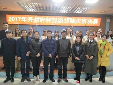 开封府副总经理修振明、开封市旅游委导游服务中心主任张平、华夏旅行社总经理万志刚、国家旅游局导游大师杨蕴杰、黄河水院教务处副处长王婧、旅游系主任焦红强、旅游系副主任余楠出席并担任评委。旅游系2017空乘专业的部分学生承担了大赛的礼仪服务工作。