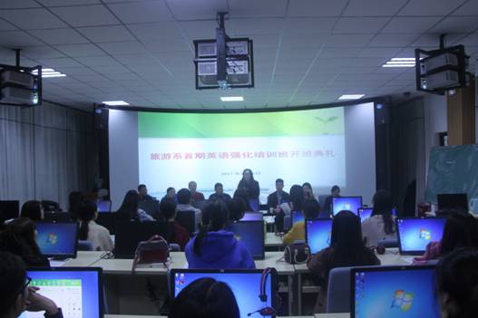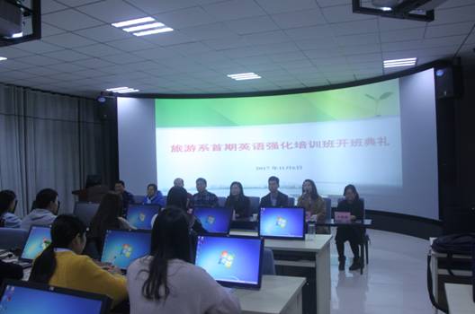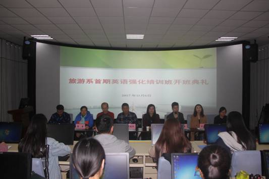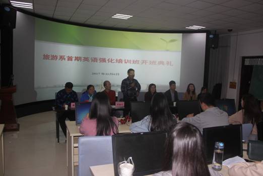 为搭建国际化语言服务平台,进一步提升学生职业竞争能力。旅游系于11月6日晚上19点,在SY5102教室举行首期英语强化培训班开班典礼。国际教育学院院长陶永霞,旅游系主任焦红强、书记樊建科、部分专业教师以及34名参培学生出席了此次活动。