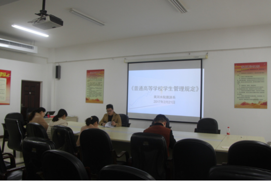 会议由王老师宣布开始,首先,樊书记做了重点发言,针对会议的背景、目的、意义及学校的安排等做了说明。紧接着,由分团委书记王忠伟老师带领学工部全体老师认真学习《普通高等学校学生管理规定》的相关内容。