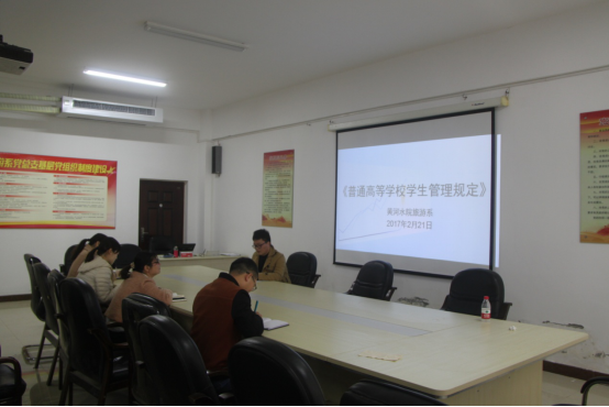2017年2月21日下午,旅游系教工部在旅游系会议室SY5201召开学习《普通高等学校学生管理规定》的专项会议,此次会议按照黄河水院学生处的统一部署,在旅游系学工部老师的精心准备和策划下召开。旅游系党总支书记樊建科、分团委书记王忠伟、2014级辅导员闫曾、2015级辅导员周瑞雪、2016级辅导员卫聪聪及学工部老师张宾宾参加了此次会议,此次学习会议由王忠伟老师主持。