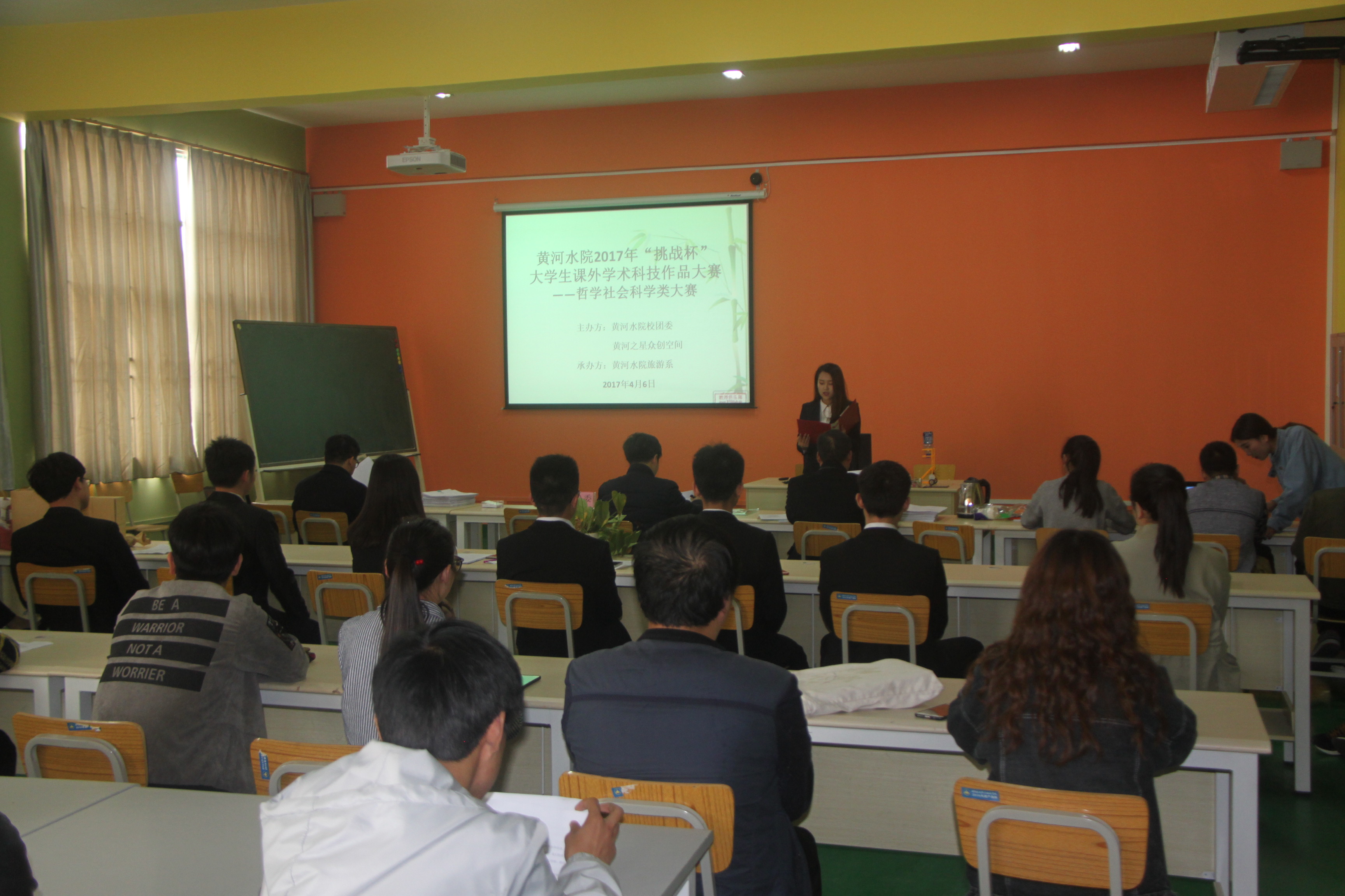 2017年4月6日下午,在SY5106实训室,黄河水院2017年“挑战杯”大学生课外学术科技作品大赛(哲学社会科学类)成功举办。此次大赛由黄河水院校团委、黄河之星众创空间主办,旅游系承办。黄河水院校团委书记刘许亮、学生处副处长王国英、旅游系党总支书记樊建科作为特邀嘉宾和评委出席此次大赛。