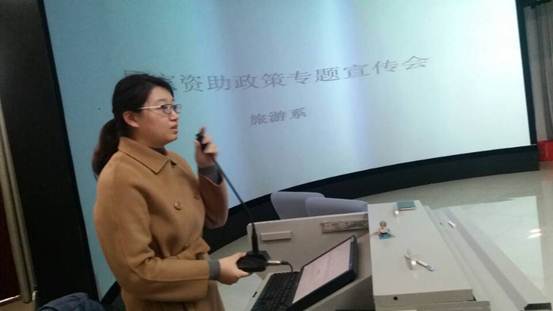 为进一步加大学生资助政策的宣传,使学生了解国家学生资助政策。旅游系分团委分别于11月28日下午1点在SY5102召开“旅游系国家资助政策专题宣传会”,系分团委书记王忠伟、16级辅导员卫聪聪、15级辅导员周瑞雪和系资助老师闫曾参加此次宣讲会。会上,系资助助理曹阳同学分别向15级、16级学生介绍了国家奖学金、励志奖学金、优秀学生奖学金和助学金的政策及评定条件。接着,资助老师闫曾介绍了国家开发银行助学贷款的还款事项以及系统操作说明,并向申请高校贷款的学生示范申请提前还款的系统操作流程,并鼓励同学们积极偿还助学贷款。会后学生们表示对国家的奖助政策有了更进一步的了解,并承诺一定会按期偿还助学贷款。