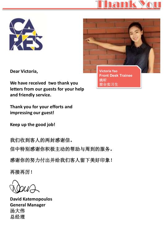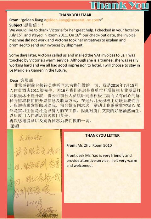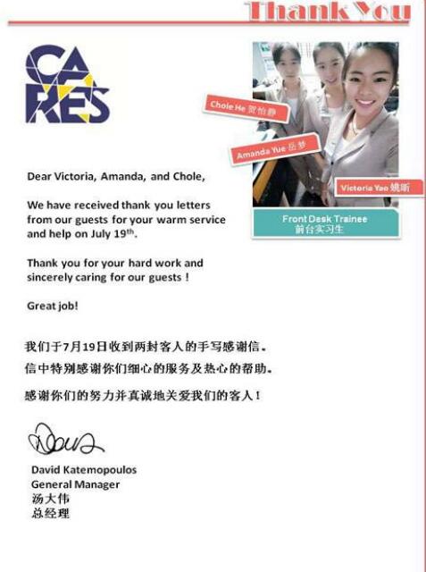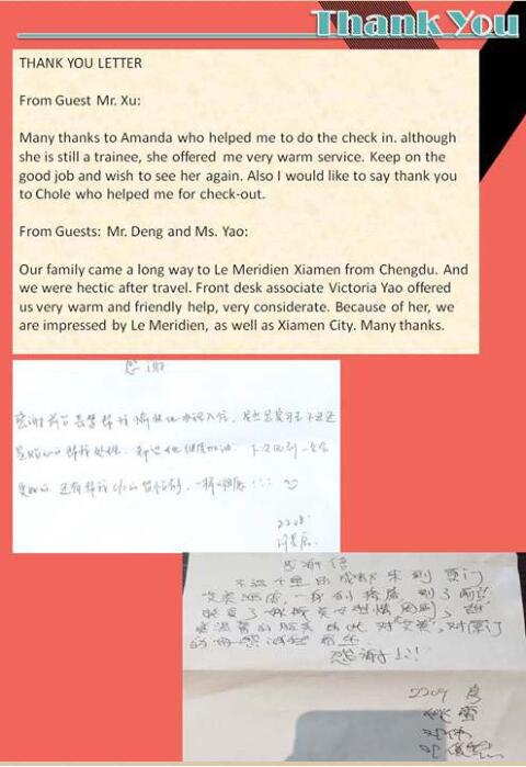 此次发来感谢信的厦门艾美酒店是一家国际品牌酒店,隶属世界知名的喜达屋酒店及度假酒店集团,是厦门目前最高端的国际五星级品牌之一。该酒店是我系酒店管理专业的长期合作单位。已有多名我专业毕业的学生在该酒店中成长为中层管理人员,成为酒店不可或缺的人才。