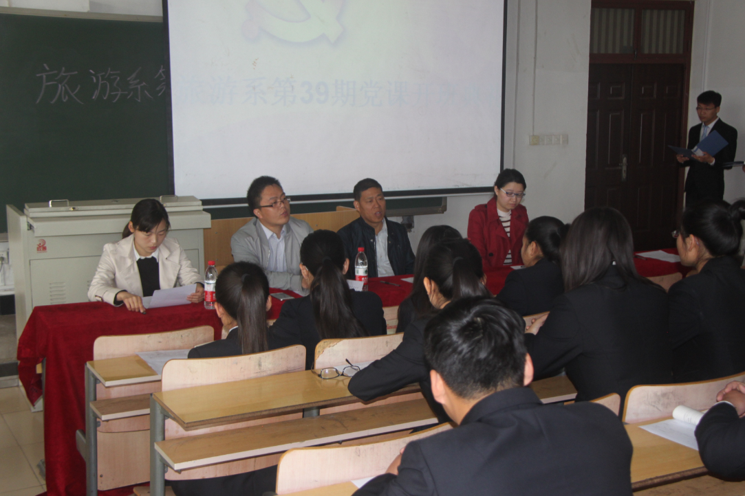 4月17日上午8点,旅游系在JX2403举行第39期党校积极分子培训班开班典礼。旅游系党总支书记樊建科,旅游系分团委书记王忠伟,本期党校积极分子培训班班主任周瑞雪,学工部老师闫曾和21名学员参加了开班典礼。