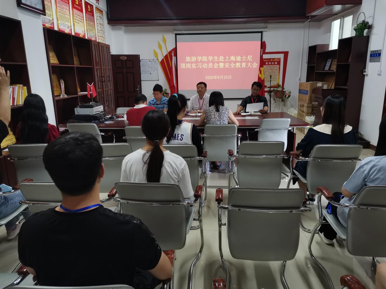 6月25日上午,旅游学院在会议室召开赴上海迪士尼顶岗实习动员暨安全教育大会。院领导刘岩、焦红强、徐永红、校企办公室、旅游教研室负责人、迪士尼录用的9名学生参加了此次会议。会上,刘岩对9名同学被上海迪士尼录用表示祝贺,他强调实习学生牢记身份、高标准要求自己;要牢记“守诚、求新、创业、修能”校训,抓住难得的国际品牌企业实习机会,不断提升自我素质;要严格遵守上海迪士尼的各种规章制度,树立动态、竞争意识,用心实习;要提高防疫、人身、财务、交通、食品等方面安全防范意识,做到万无一失。焦红强要求同学们处理好短期利益和长远发展的关系,不断学习新的发展理念和管理经验;增强韧性,不断调整自我,提升沟通和协调能力;牢固树立安全第一,身体健康第一位的意识。徐永红、程兴亚、张宾宾等也与本次实习的同学们就相关的注意事项等进行了交流和沟通。