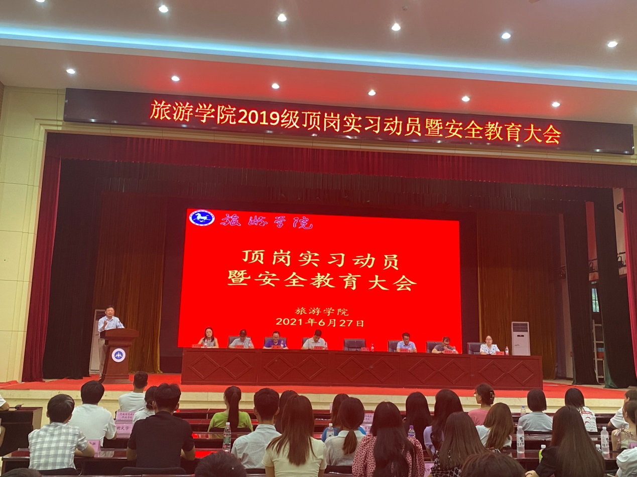 为扎实做好旅游学院2019级393名学生的顶岗实习工作,教育和要求47名学生党员、45名发展对象在顶岗实习工作中的先锋模范和表率作用,加强顶岗实习学生的思想稳定和安全教育,以“我为学生办实事”之“提升顶岗实习单位层次、提高顶岗学生满意度”为党史学习教育的成果,为建党的一百年华诞献礼。6月27日19:00 2019级顶岗实习动员暨安全教育大会在学生活动中心隆重召开。旅游学院党总支书记刘 岩、院长焦红强、副书记徐永红、副院长余 楠、旅游管理专业教研室主任张宾宾、酒店管理专业教研室主任郭 娜、空中乘务教研室主任周菲菲、2019级辅导员、班主任刘梦丽、程 露、程兴亚及全体2019级学生参加了会议。会议由校企合作办公室主任程兴亚主持。