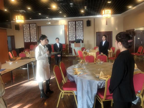 首先,酒店管理教研室主任郭娜对陈初老师的到来表示热烈的欢迎,随后陈初老师就世界技能大赛的赛项规程、操作细节,以及中餐主题宴会设计、宴会服务两个模块和西餐鸡尾酒调制与服务和休闲餐厅服务两个模块进行细致指导,强调了学生的服务意识,对学生操作不规范的地方进行了纠正,注重学生职业素养的提升,强调工作的规范化、实境化、流程化与职业化。