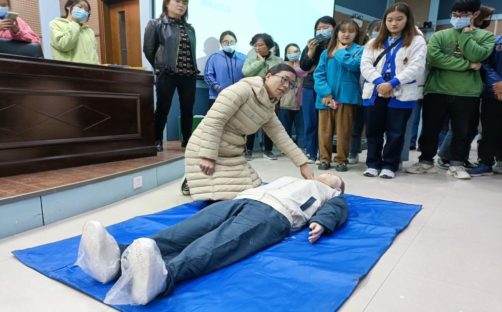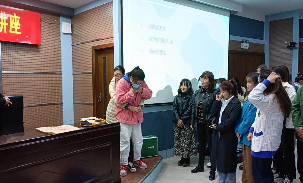 讲座内容分为急救理论知识和现场操作两个部分,白老师在理论知识部分采取多媒体授课的方法,和大家分享了危急关头如何开展现场急救,白老师使用通俗易懂的语言,结合日常实例重点讲述了骨折急救、气道异物梗阻急救、心肺复苏术、食物中毒处理紧急救护的基本原则、方法步骤等急救知识。