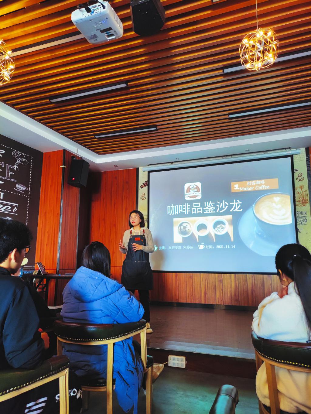 2021年11月14日下午,由创客咖啡大学生众创空间主办的“咖啡品鉴沙龙”,在我校餐厅五楼的创客咖啡厅举办。来自我校各学院的三十余位同学参加了此次咖啡文化分享活动。活动中创客咖啡的指导老师宋莎莎为同学们普及了关于咖啡的一些文化知识,包括咖啡的文化起源、咖啡豆的品种、咖啡的生产加工过程、以及如何品鉴一杯咖啡的风味。