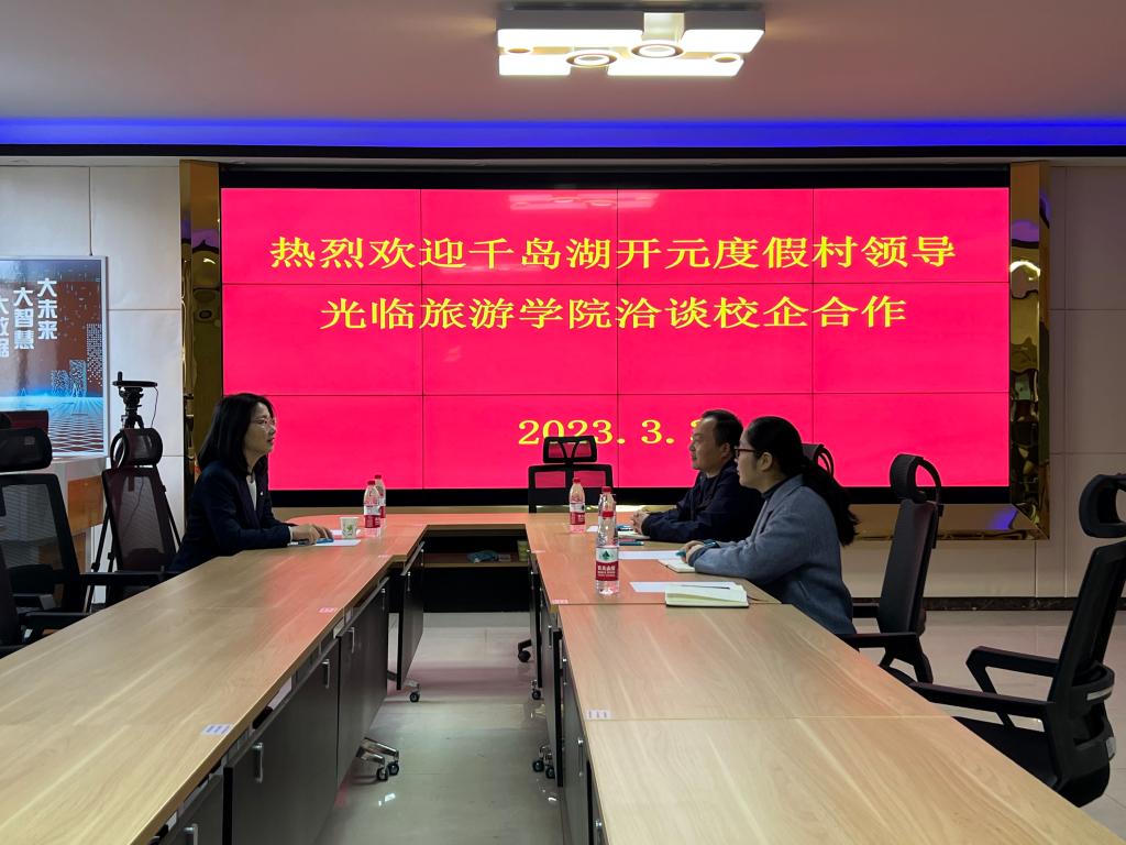 廖颖总监对我院的招待和欢迎表示感谢,并详细介绍了我院学生在千岛湖开元度假村工作的情况,表达了对我院学生的肯定与认可。廖颖总监向我院表达了强烈的合作意愿,希望未来与我院继续加强沟通交流,在学生实习就业、教师企业锻炼、企业兼职讲师聘任等方面深入合作。