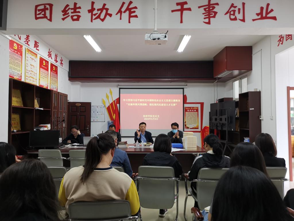 5月9日下午,旅游学院党总支在党员活动室组织主题教育专题理论学习会议,学习《习近平新时代中国特色社会主义思想专题摘编》中的篇目“实施科教兴国战略,强化现代化建设人才支撑”,学院全体教职工参加会议,会议由党总支书记刘岩主持。