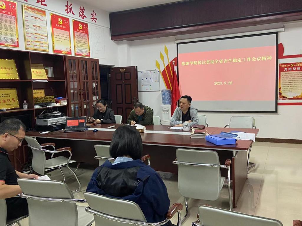 2023年9月26日,旅游学院召开安全稳定工作会议,传达全省教育系统安全稳定视频会议相关精神,会议由党总支书记刘岩主持,班子成员及全体科级干部参加会议。