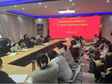 1月16日下午,旅游学院党总支在实训楼5201召开团体会议,认真组织学习《中国共产党纪律处分条例》,会议由党总支书记邹新忠主持,全体学院教职工参加会议。